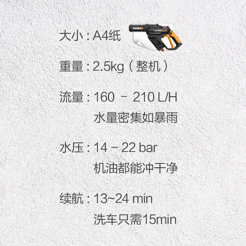 内置大容量锂电池,续航持久,可持续使用13-24min。并支持多档调节,搭配5合1喷头,充分满足不同使用需求。