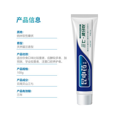 采用先进口腔护理技术,甄选云南高品质三七,低温萃取,呵护牙龈。添加优质摩擦剂,深入清洁,不伤牙釉质。