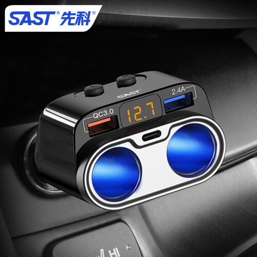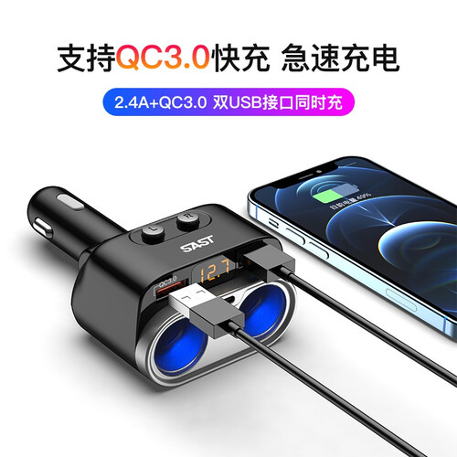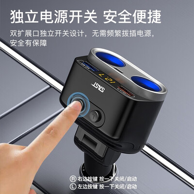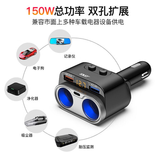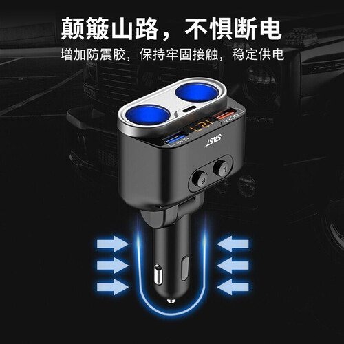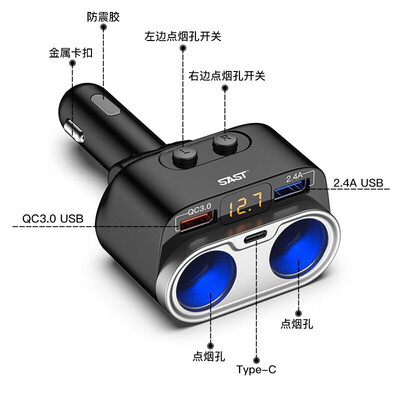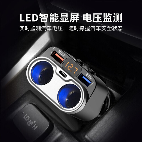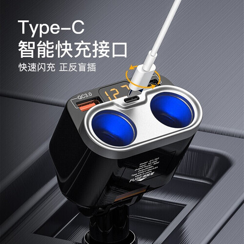双点烟孔+双USB + Type-C,可同时连接手机、行车记录仪等五台电子设备满足多种充电需求。
