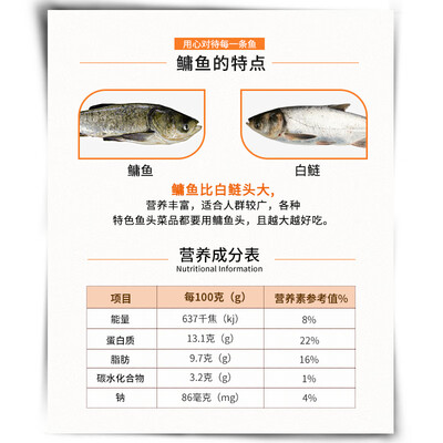 这款产品精选新鲜个大的原生态鳙鱼,鱼头个大肉多,营养物质全面丰富。含有大量胶冻状物,补充胶原蛋白,多样做法都可以。