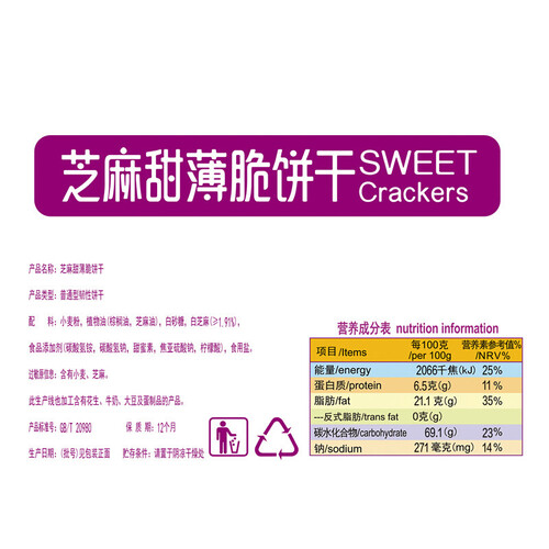 严格把控饼干的烘焙温度和时间,打造酥脆好口感。经过层层筛选的优质芝麻,均匀铺满饼干,丰富香气层次。