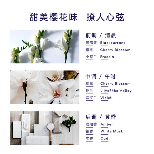 含有樱花香氛的沐浴露,清洁后肌肤浓郁芳香,充满了迷人的味道。其温和保湿的效果不刺激肌肤,避免干燥而引起细纹。