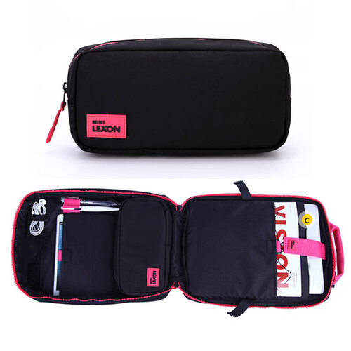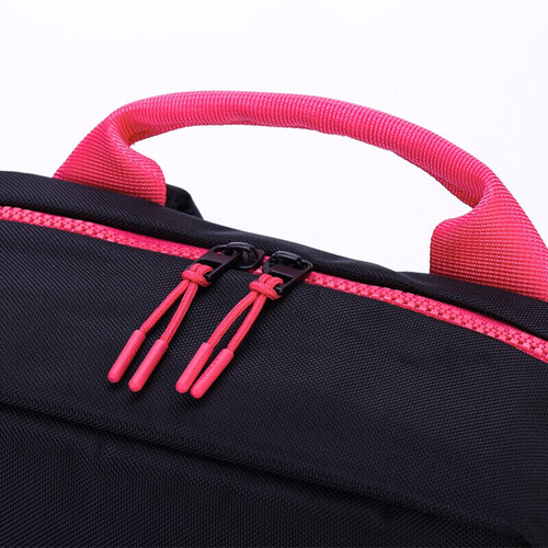 黑色包面配粉色手提把,时尚不沉闷。前幅袋设计,小物件收纳方便。