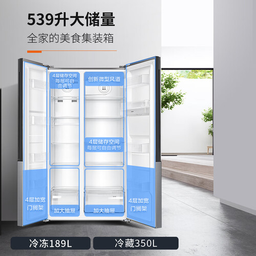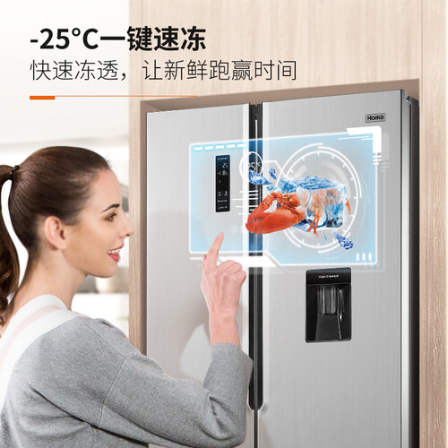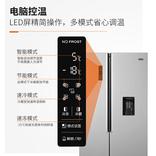 这款冰箱将冰箱与饮水机功能合二为一,有效节约空间,还增强了实用性。配有LED屏装置,让拿取食材更简单。