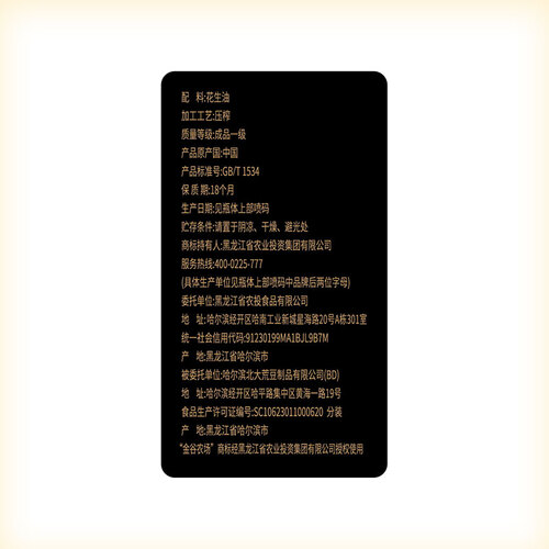 精心选用黑龙江黑土地的大花生为原料,非转基因并且颗粒饱满,使得花生油的品质更加纯正。油品色泽金黄透亮,自然芳香更美味。