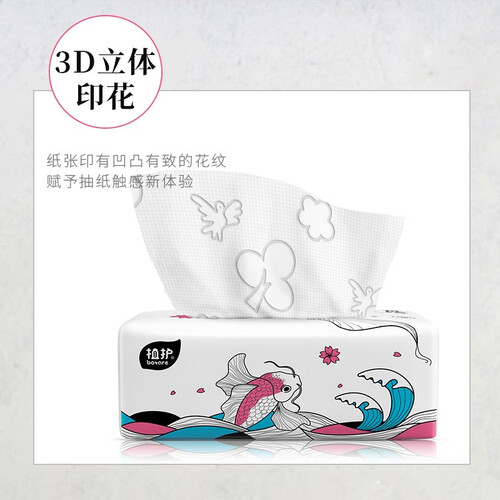 抽纸采用3D立体压花工艺,大大的增加了立体感和厚度,可以带来更好的使用体验。精美的外包装设计,凸显品质。