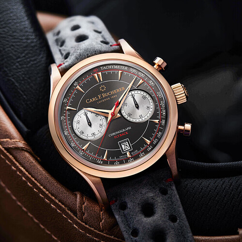 3:00和9:00位置有计时器,出色的功能,让整体的设计更加鲜明。表盘边缘有测速计刻度,功能明确。
