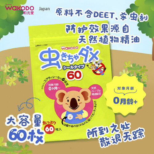 日本制造原装进口,采用天然植物桉树精油制成的防蚊贴。一袋六十枚入,大容量持久耐用。温和配方,有效却不刺激肌肤。
