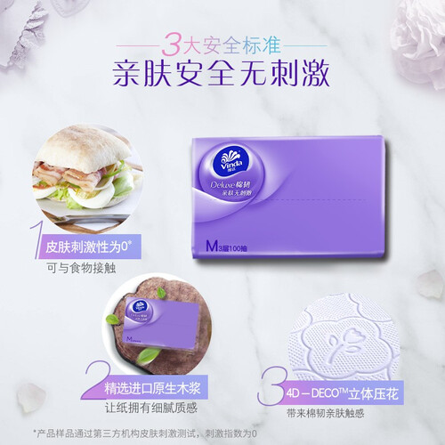 选用进口优质木浆制作,不添加其它有害成分,不会出现刺激肌肤的问题,使用更加安全。还有立体压花设计,让纸张拥有棉质触感。