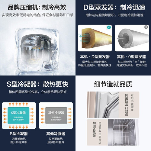 采用S型冷凝器,四周环绕包裹,立体散热效果更快更好。搭载三重气囊门封条,严密锁冷,拆洗更方便随心。