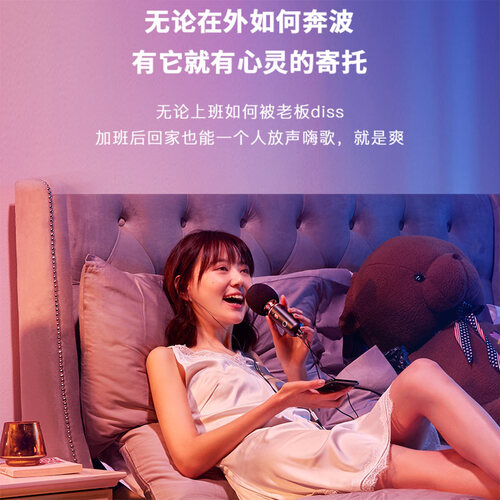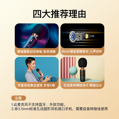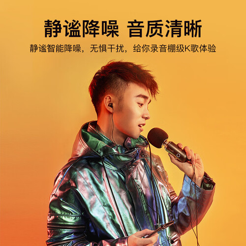 可静谧智能动态降噪,净化环境杂音,带来沉浸式K歌体验。配有16毫米镀金振膜音头,使录制的声音更清亮有质感,让声音更动听。