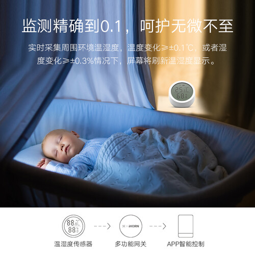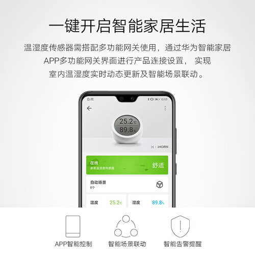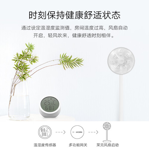 采用LED屏幕动态显示实时温湿度,一目了然更加方便。与其他智能设备联动实现室内温湿度自动调节,营造舒适居住环境。