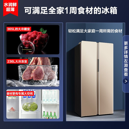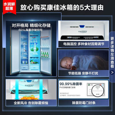 601升大容量空间存储,各种瓜果青菜海量存储,满足不同使用需求。全新风冷技术,制冷速度快,告别除霜烦恼。