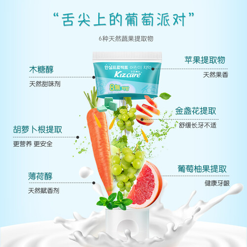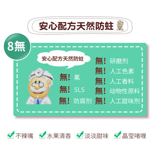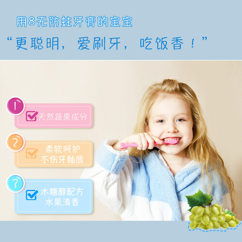所用成分均为水果萃取精华,可以吞咽,宝宝使用更安全。天然木糖醇,清洁口腔,同时减少牙齿酸蚀,预防蛀牙。