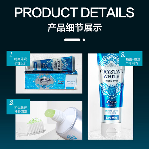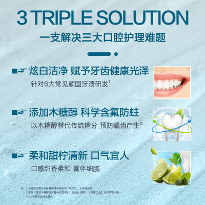 这款牙膏蕴含丰富炫白粒子,可以有效去除多种牙渍,炫亮美白牙齿,同时还搭配甜橙薄荷口味,口气更清新。