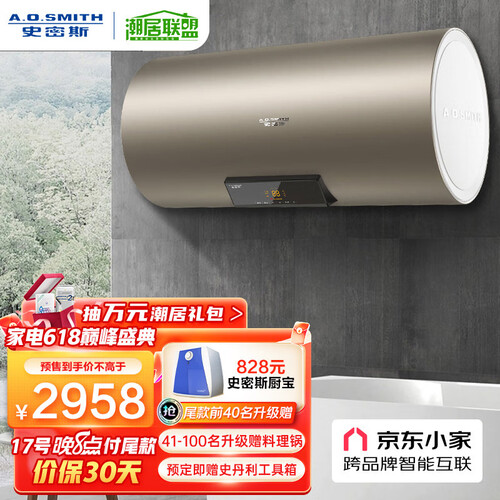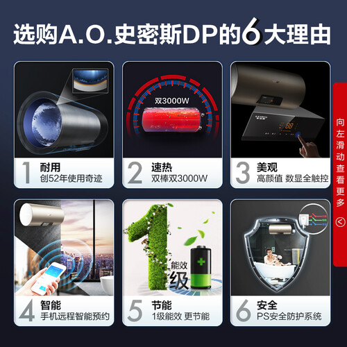 拥有80升水箱,一大家洗都可以,晶彩设计贴心准确。支持APP智能操控预约,温馨洗澡从它开始,双3000W速热每一天。
