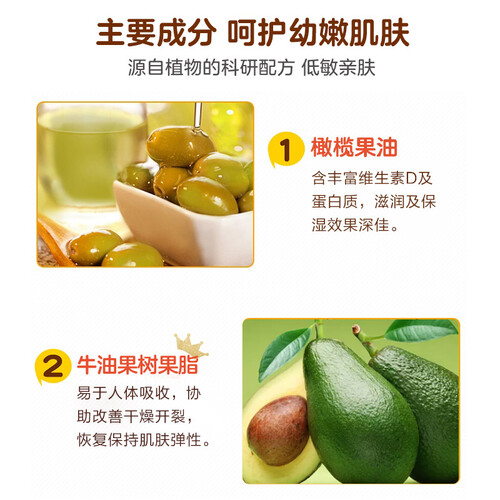 源自植物的科研配方,低敏亲肤,适合宝宝使用。橄榄果油的加入,丰富的维生素D及蛋白质,滋养效果倍增。