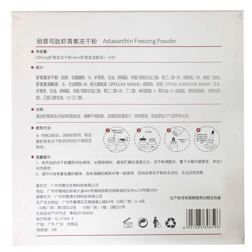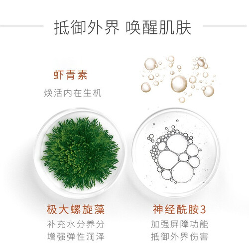 富含虾青素提取物和神经酰胺,可焕活肌肤的抗氧化力,舒缓干燥缺水肌肤,高效锁水,提亮肤色淡化痘印,加强肌肤修护力。