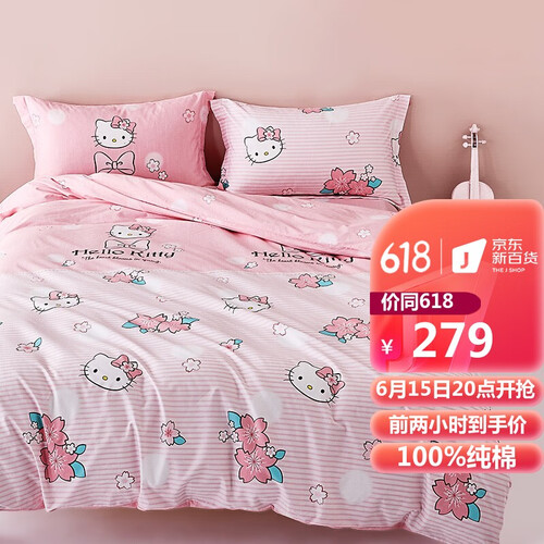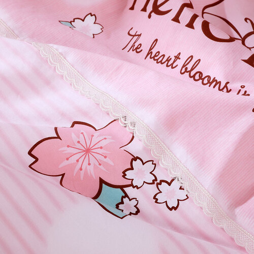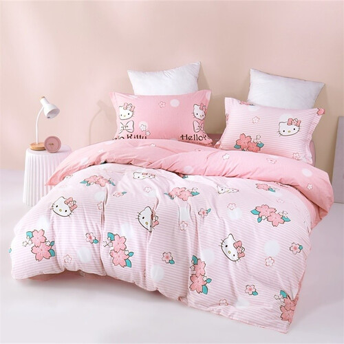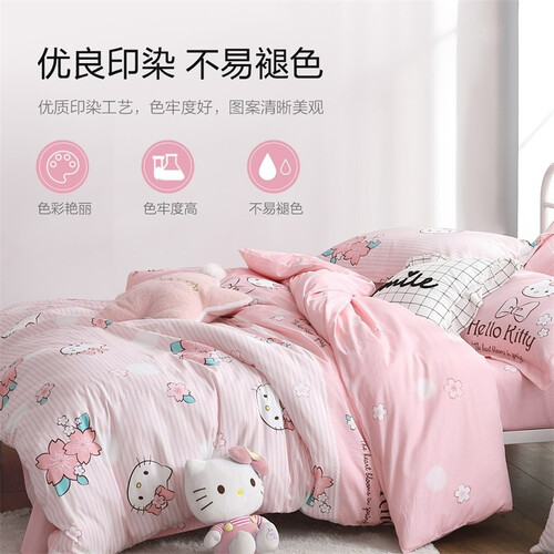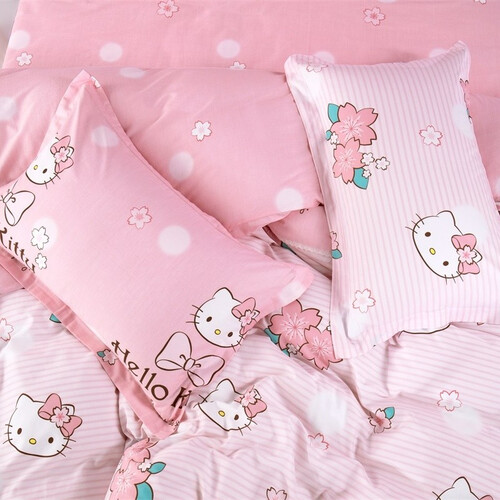 选用全棉面料,精密的斜纹工艺织造,手感柔软,睡感舒适。可爱的樱花和Hello Kitty结合印染在粉色条纹,可爱少女。