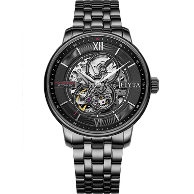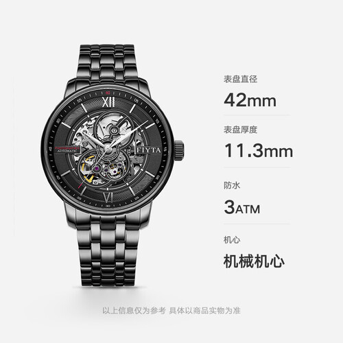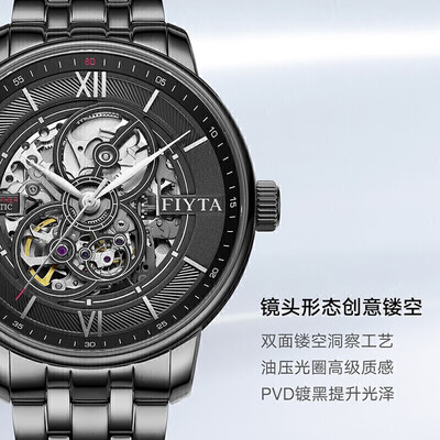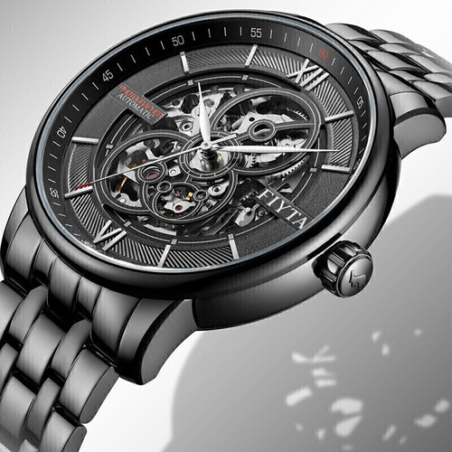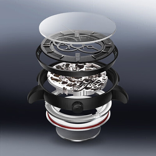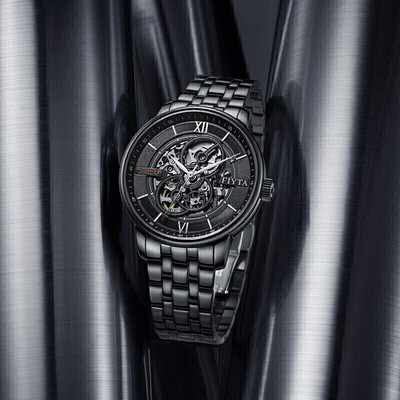 手表线条圆润,细节处理细腻,尽显绅士风度。采用黑色表盘加上镂空机械表盘设计,简洁大方,时尚百搭,彰显气质。