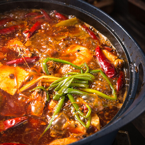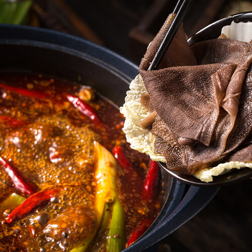 采用醇正牛油和其他提鲜配料,由经验丰富且手法老练的老师傅精心炒制。经过八小时的慢熬,释放出食材的香气,满屋飘香。