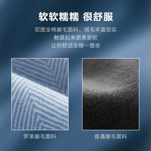 选全棉面料,经过双面磨毛工艺处理,绒毛丰富密实,触感柔软。相比于普通面料,更加厚实,更加保暖,更加耐用。