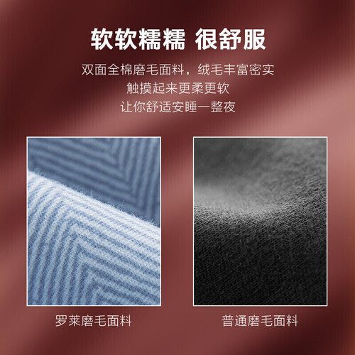 全棉面料吸湿透气;素色人字纹肌理,简约凸显大气;经过磨毛工艺处理,使其有短而浓密的绒毛,提供良好的保暖效果。