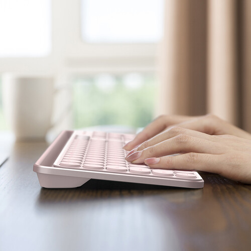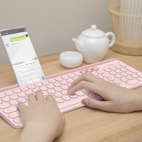 樱花粉配色,细腻触感,圆形按键简洁灵动,美观时尚,女性玩家适用。120键全尺寸按键,前置软胶支架,享受舒适键入体验。