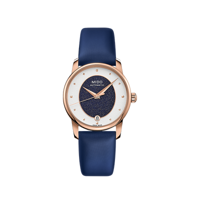 白色的粒面表盘设计演绎别致的细腻美感,犹如星空般闪耀,表带采用蓝色的缎面织物,质感出众散发迷人魅力。