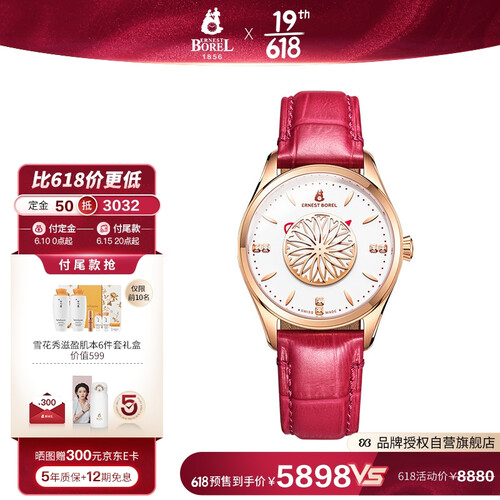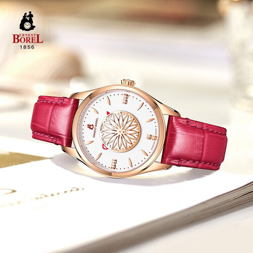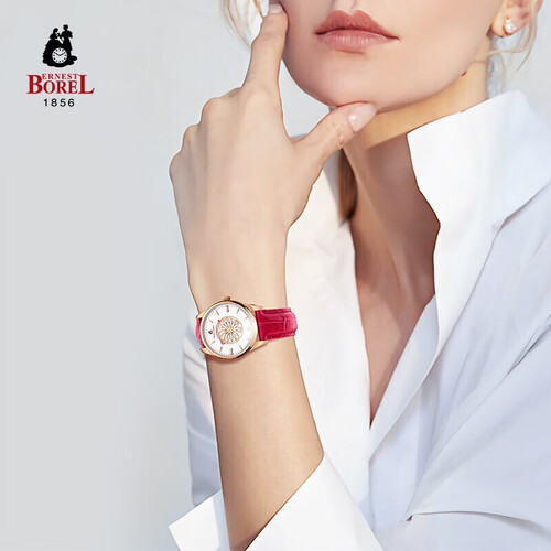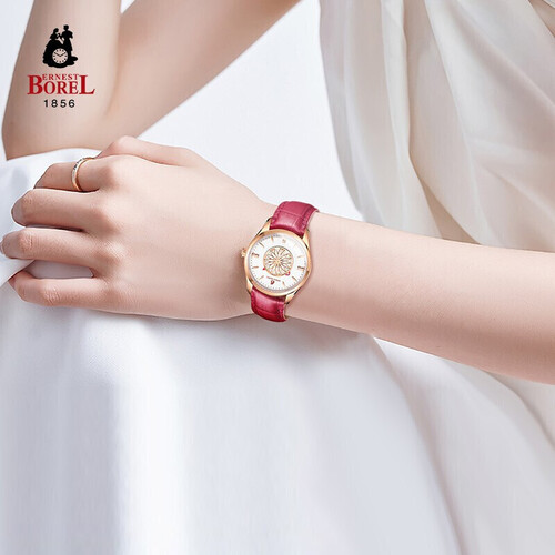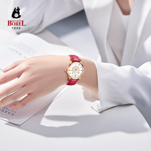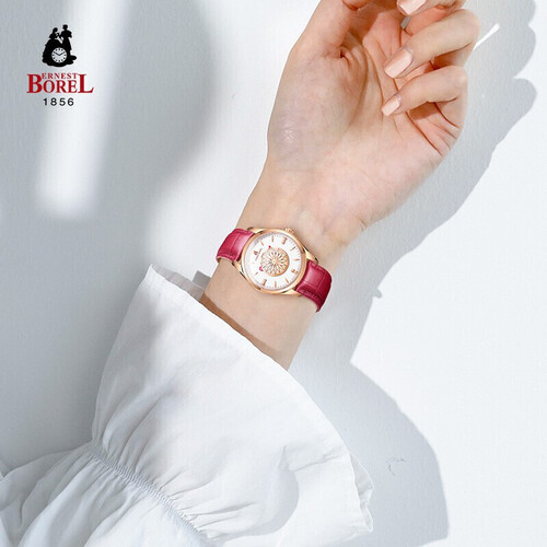 采用纯净洁白的搪瓷表面设计,尽显简洁优雅。樱桃红配色皮带,色彩细腻,皮质舒适,非常贴合手腕,映衬白暂肌肤。