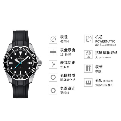 采用DS双保险的技术,性能更加的平稳,动力也很强劲,走时更加的精准。柔软耐磨的橡胶表带,佩戴在手腕上非常舒适亲肤。