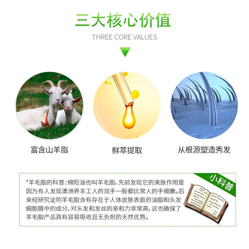添加来自澳洲的山羊脂成分,给发丝提供营养成分,可以改善发质毛躁,保持头发滋润柔顺。
