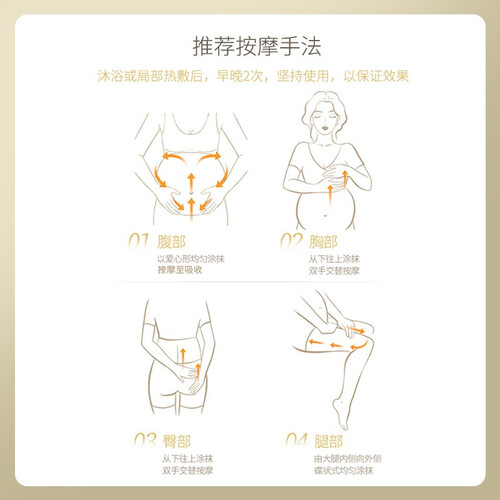 采用植萃配方,成分纯净自然,孕妈妈肌肤护理选用温和不刺激,安全放心。具有淡化印痕和纹路的特点,让肌肤更加紧实弹嫩。