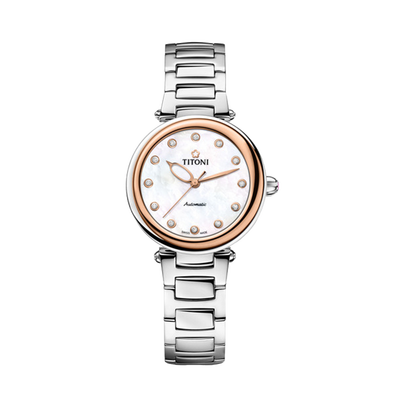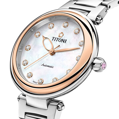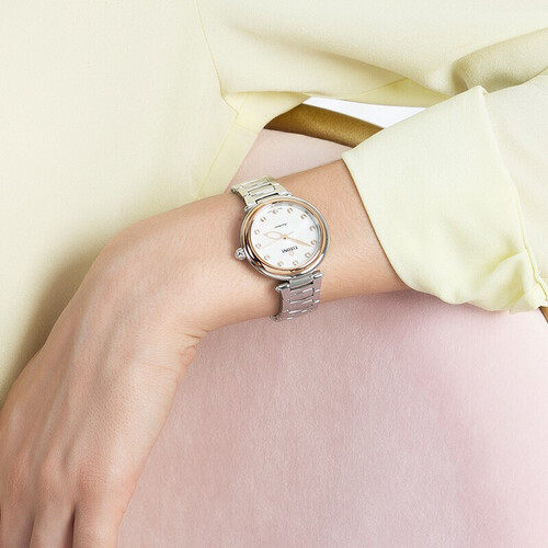 表盘采用珍珠贝母打造,散发着莹润柔美的光泽,优雅迷人。金银撞色设计,醒目有格调,更具时尚气息。