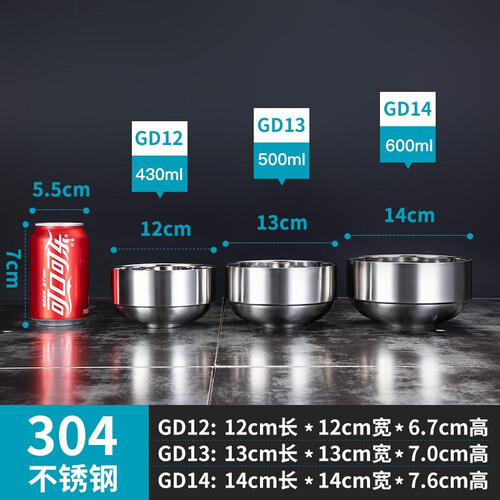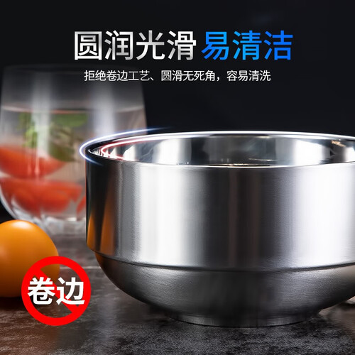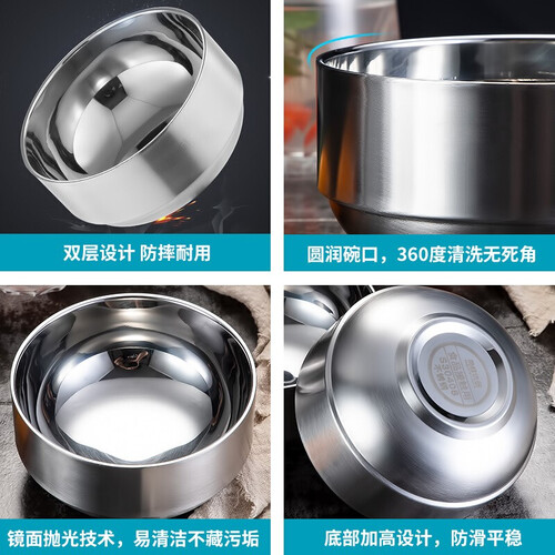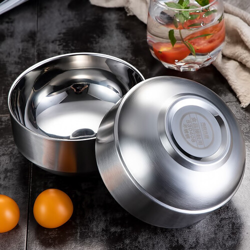 圆形外观碗,边角拉伸处理,圆滑手感舒适防烫手。4.5英寸不锈钢材质双层加厚,耐摔结实轻盈。