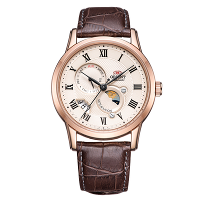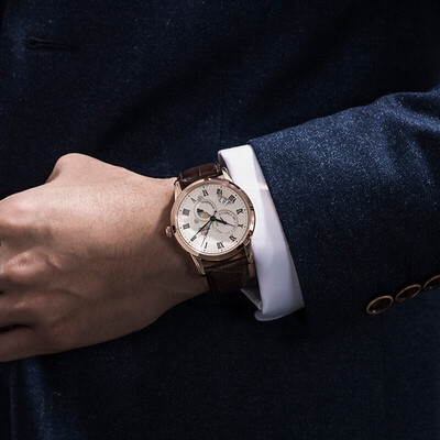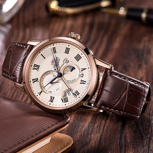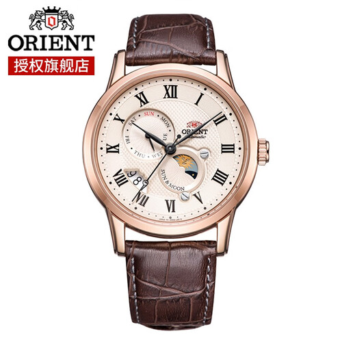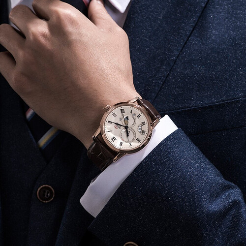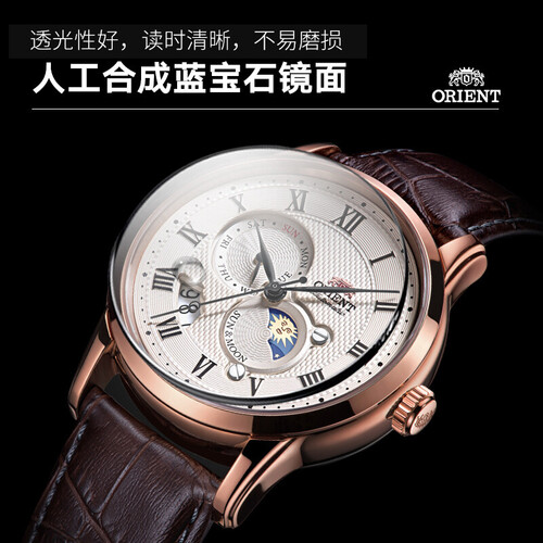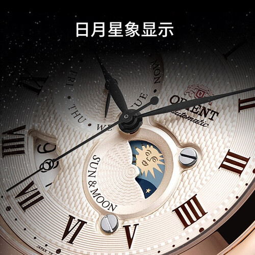 星盘样式的日月显示,搭配古典纹饰的表盘设计,释放出别具一格的魅力。进口牛皮表带,充满质感,彰显佩戴者的品味。