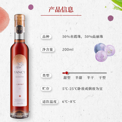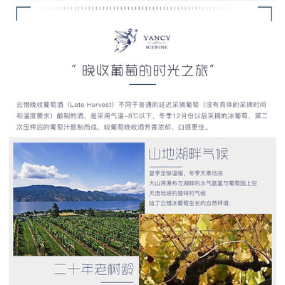 精选冬季采摘的结冰葡萄,二次压榨后再入桶酿造,比普通采摘的葡萄更为馥郁芳香,口感也舒适不刺激。