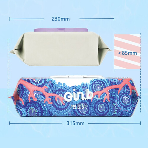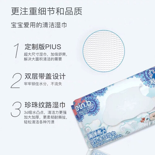 怡恩贝带盖婴儿湿巾,定制版Plus尺寸设计,可覆盖全脸的面积,布面试原本湿巾的2倍大,感受是省时省力的全面清洁,更舒心。