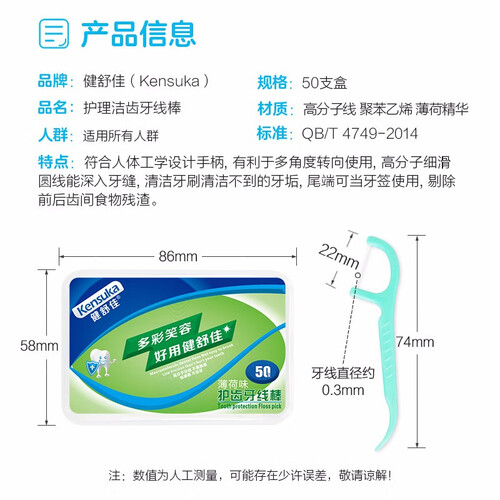 选用优质原料符合人体工学的手柄设计,多角度转向使用更方便。选用优质棉纱与聚苯乙烯材质制作而成,环保安全,健康呵护牙齿。