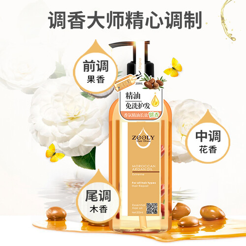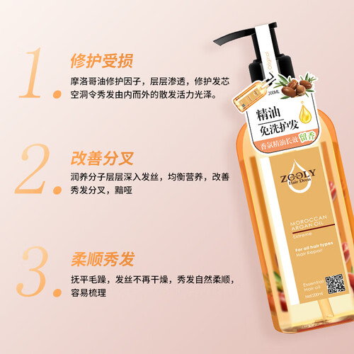 含摩洛哥油修护因子,层层渗透,修护发芯空洞现象;加持植物成分,有效修护毛鳞片,滋养角质层,抚平毛躁,给予头发光泽和质感。