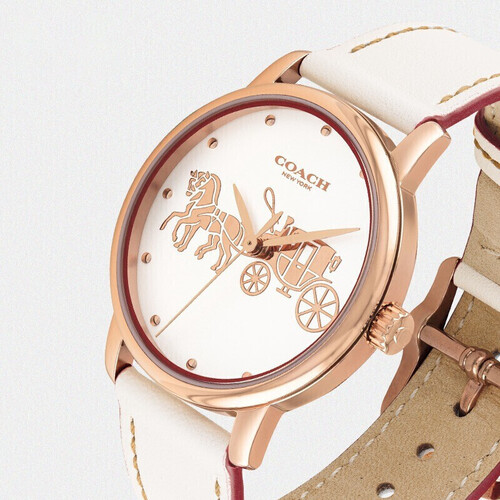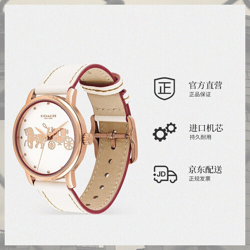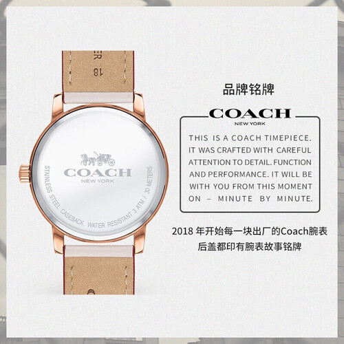 简约纯白表盘上点缀着蔻驰经典车马标识,精湛的浮雕工艺处处彰显着品牌不凡的匠心工艺。30米防水功能,无惧阴雨连绵。