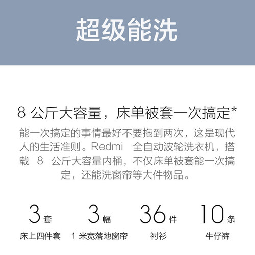 全自动波轮洗衣机搭载8公斤大容量内桶,一次搞定大件物品。独特设计的波轮配合特定转停比,减少衣物缠绕于磨损减轻衣物褶皱。