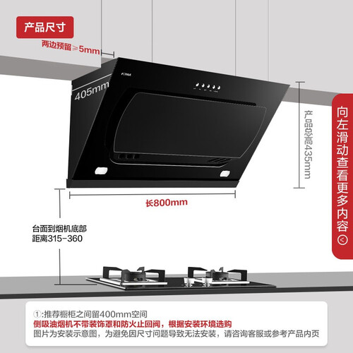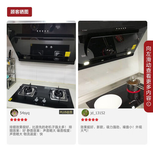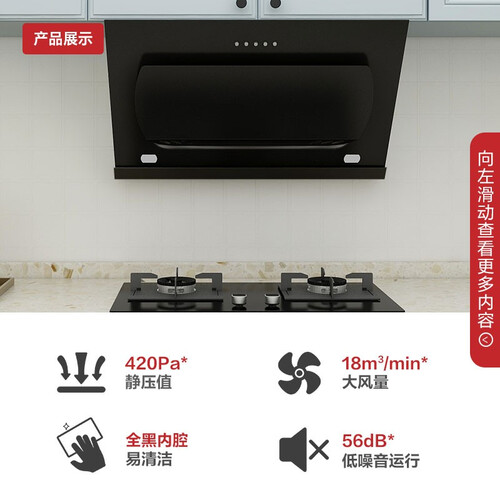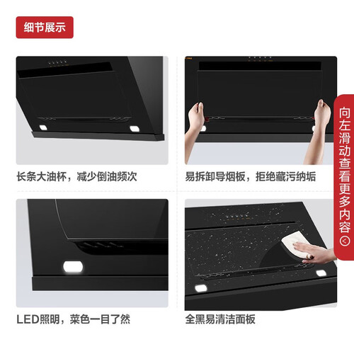 精选黑晶玻璃面板,耐高温防腐蚀,易于日常清洁。拉附环吸搭配大风量,有效锁住油烟,避免家人吸入油烟。