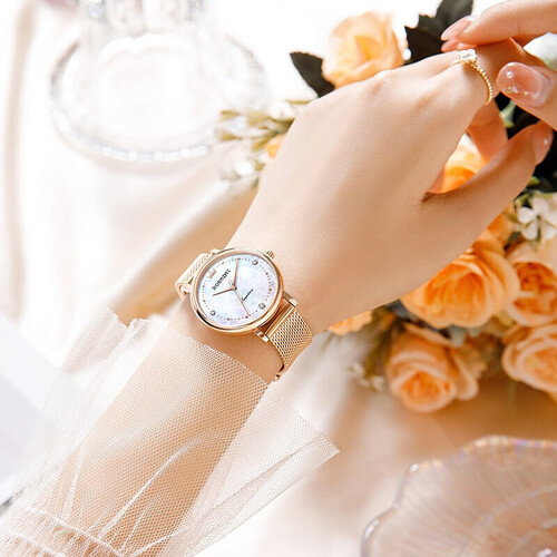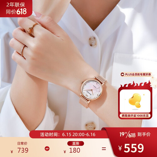 幻彩贝母表盘,从不同角度看都好看,表盘边镶嵌精美锆钻,细节更出色。材料采用进口石英机芯,手表使用寿命更长。
