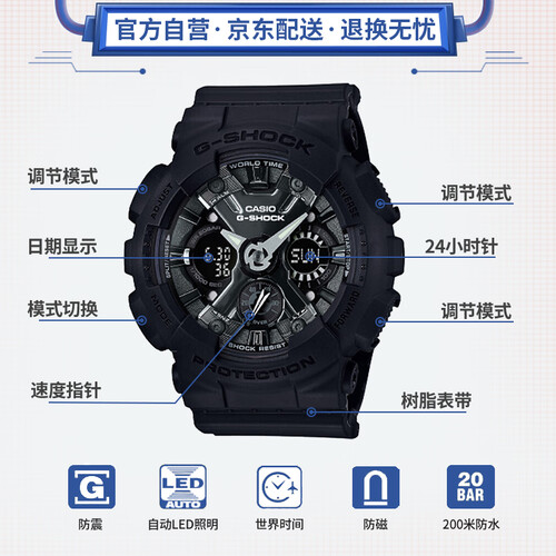 金属质感与树脂相结合,具有更佳的防水防震等功能。采用了矿物强化玻璃镜面,促使手表外观更佳的精美炫酷。