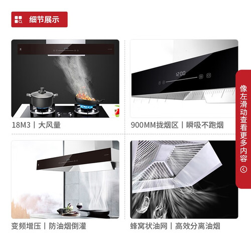 全腔900mm拢烟区,更加美观大气。变频自动增压功能,防止做饭高峰期油烟倒灌现象。熄火保护装置,让你安心走开。