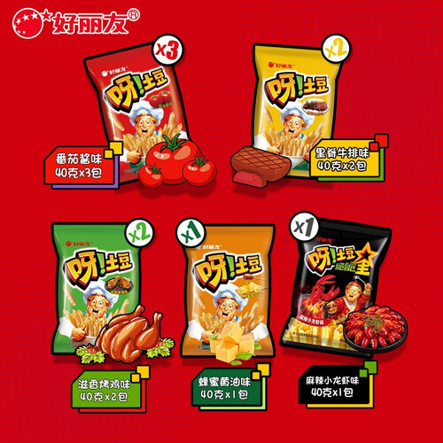 多款不同口味的膨化小零食,一次吃个够。精选优质土豆,使用不同的调味料,每种都好吃到舔手指。