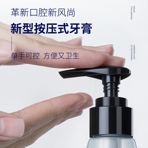 按压式的设计,单手就能轻松操作,精准控制用量。含有小苏打的成分,有效改善牙黄牙垢的现象,刷出亮白感。