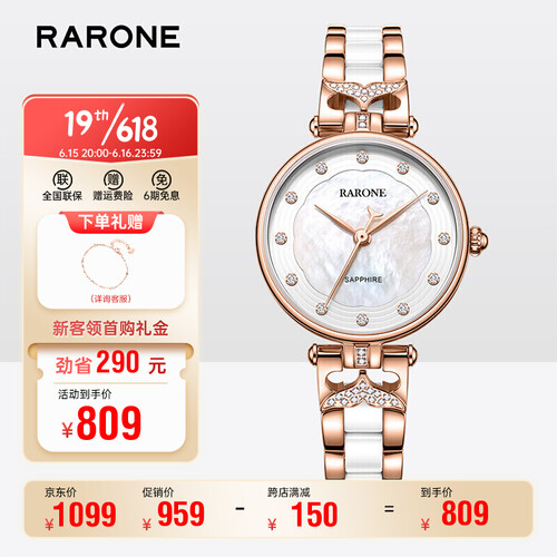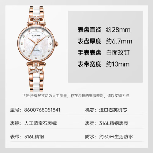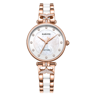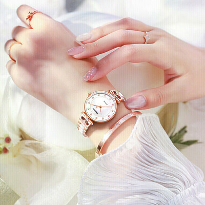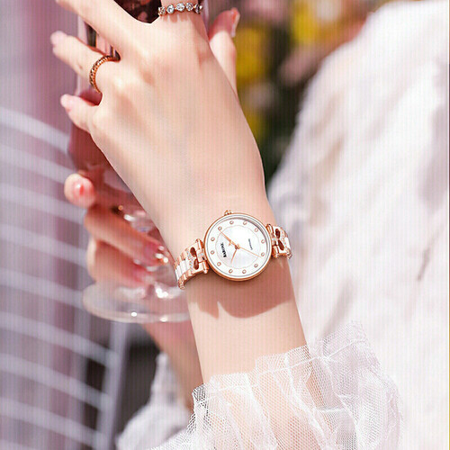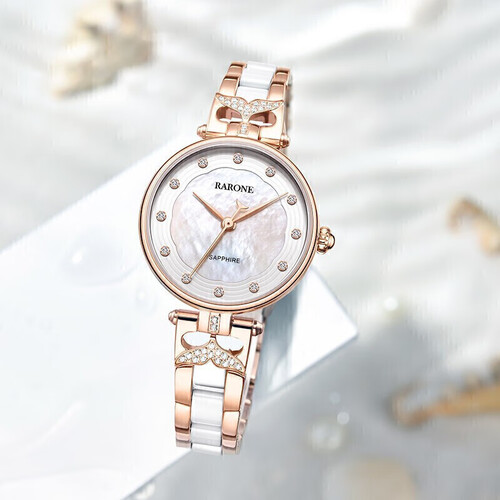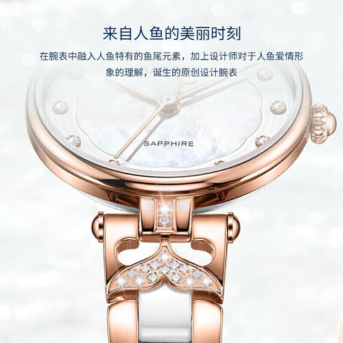 将美丽的美人鱼化为设计灵感,装点在表盘上下两侧,结合闪钻带你畅游梦幻童话。金白双色陶瓷表带,触感凉爽,夏季佩戴很舒适。