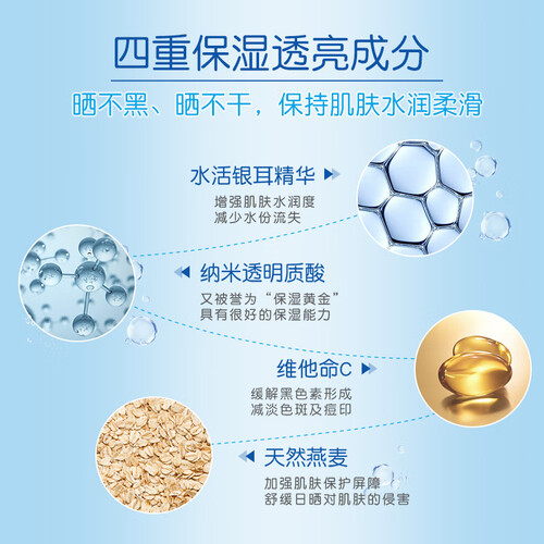 蕴含水活银耳精华,增强肌肤的水润度,减少水分流失。添加天然燕麦成分,强韧肌肤屏障,更好地守护肌肤不被晒黑晒伤。